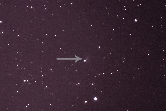 I knew from astronomy reports online that Comet ATLAS was breaking up, but the dreary rainy April weather kept me from getting out under the stars earlier to view it. Then, once my window opened, the comet was already in the process of breaking up. Still, I pounced on the opportunity and took out my camera on the tripod. After an hour of trying various long exposures (with no tracking motor), I landed on one frame with a hazy small patch of light.