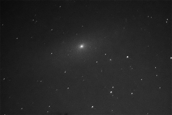Tonight is my first time observing M31 through an 8-inch scope. Unfortunately, a rising moon is scratching out any dark skies left from the early evening. After trying various eyepieces with the scope, I prefer 16mm. I know for a fact that the Great Andomeda Galaxy is big enough to “spill” out over the field of view I’m looking at right now. I’m really “zoomed” in at 16mm. But for some reason right now, 16mm is picking up the most light from the object. I’m not great at drawing, but the sketch gives one a somewhat close idea of my view. The photo below shows Andromeda how it’s looking through my eyepiece. The galaxy crosses diagonally with a slightly brighter core region.