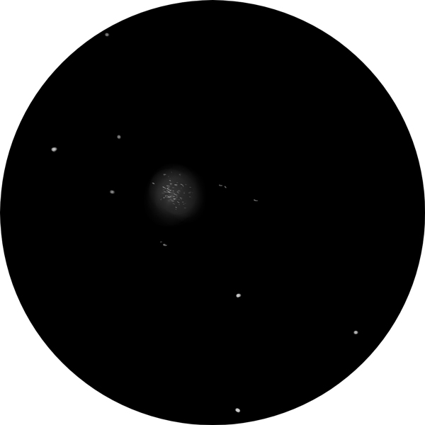 Using binoculars or a telescope, observers will find a splendid view of this glowing patch of stars hanging from high above our galactic plane. Smaller optics will only show a fuzzy patch of light, while larger scopes (say 6 inches and more) will start to pull out individual stars.