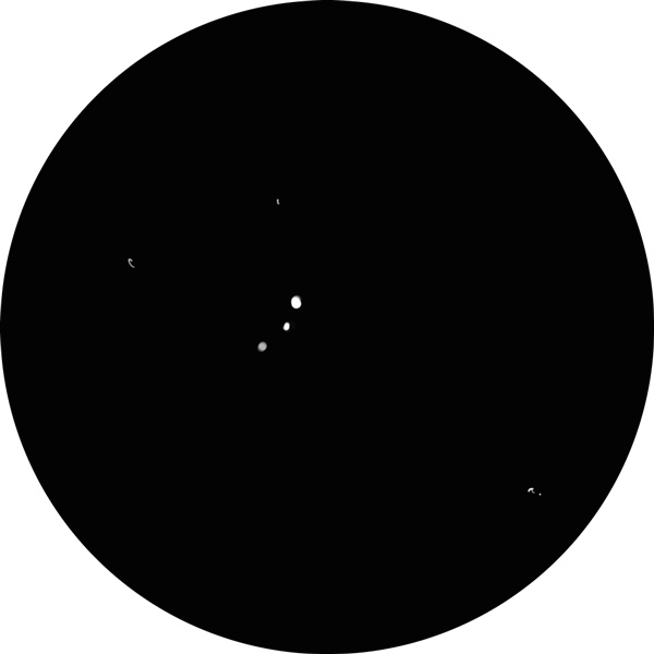 This is a good triple star system from what I can tell. A line of three brighter stars punctuates my view while several dimmer stars are sprinkled nearby. It appears the stars are blue-white in color.