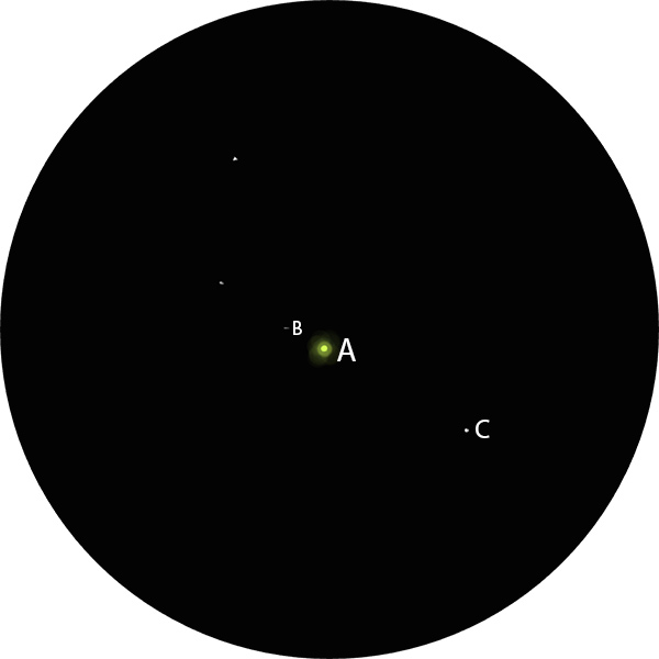 The primary, Kappa A, is a golden-rich color, while the surrounding stars appear white. Kappa B is very faint and nearby A, while the true companion, Kappa C, is farther away and brighter.
