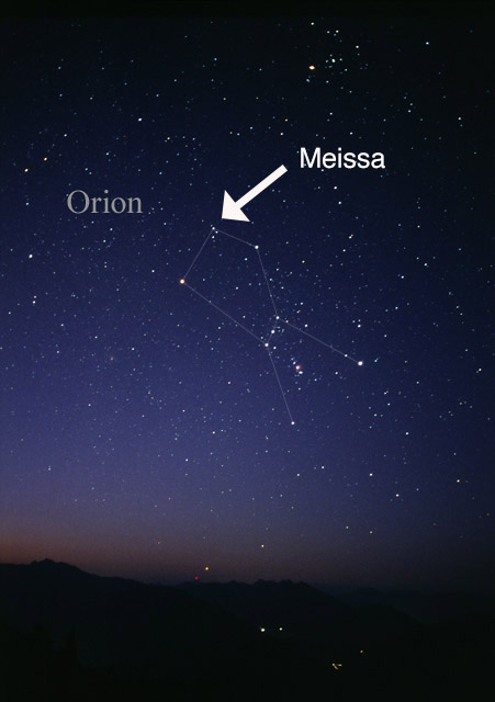 Orion the Hunter emerges from the eastern horizon, a constellation of myth and majesty, etching his mythic silhouette against the canvas of the winter sky. Marking Orion’s head is the bright star, Meissa. But it’s more than that. Aim your binoculars or telescope toward Meissa, and you’ll find a beautiful grouping of related stars. While Orion, and its notable stars like Meissa, have been known since ancient days, it was the astronomer William Herschel who first recorded Meissa’s family of stars on October 7, 1779.1