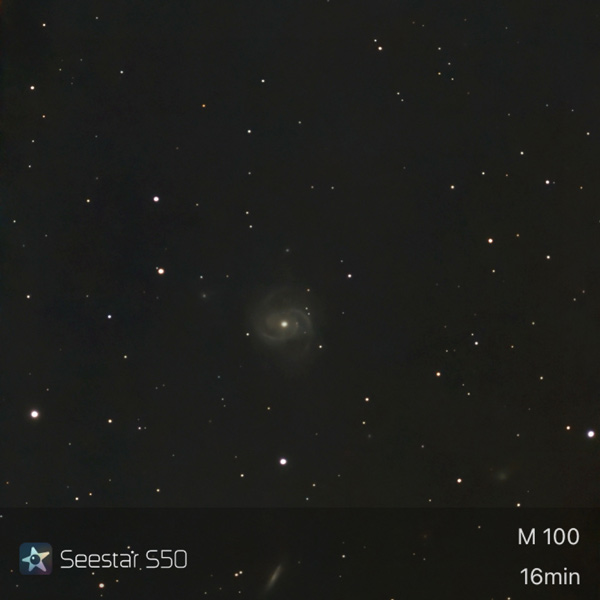 As with several of my observations recorded on this night, I decided to use the small Seestar S50, since Florida’s high humidity made me reconsider setting up my 8-inch scope, which tends to fog up quickly. Next spring, when M100 is in a better position, I plan to spend more time on the galaxy, as my 16-minute exposure just barely brings out its color and arms.