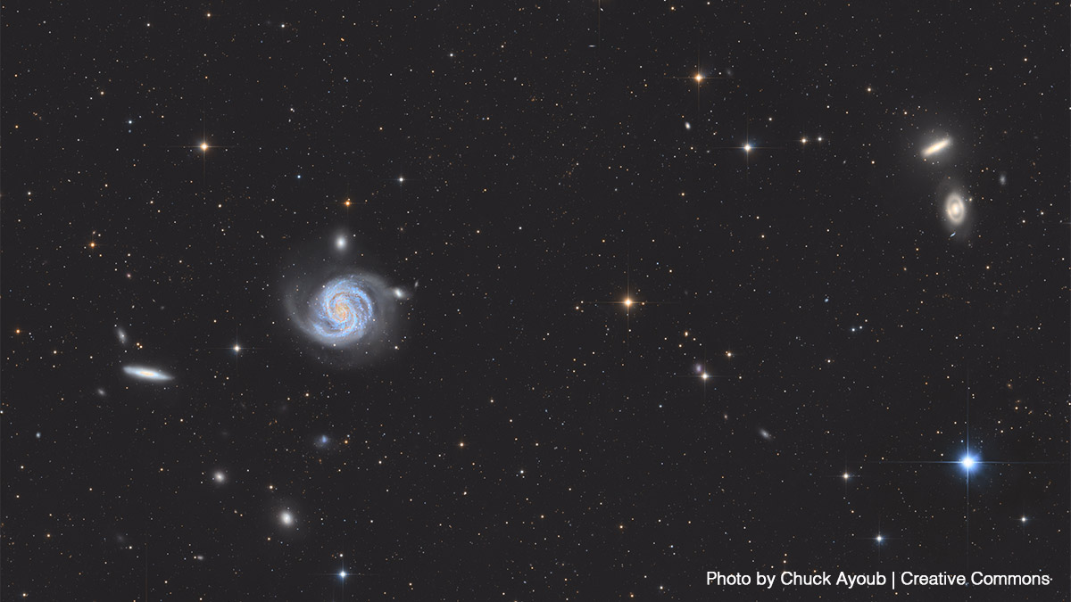 For backyard astronomers, M100 presents different levels of detail depending on equipment and conditions. Through binoculars or a small telescope (3-4 inches), the galaxy appears as a faint, round fuzzy patch with a slightly brighter center. Medium-sized telescopes (6-10 inches) under dark skies begin to reveal the galaxy’s oval shape and brighter nucleus, with the outer regions appearing mottled or uneven.